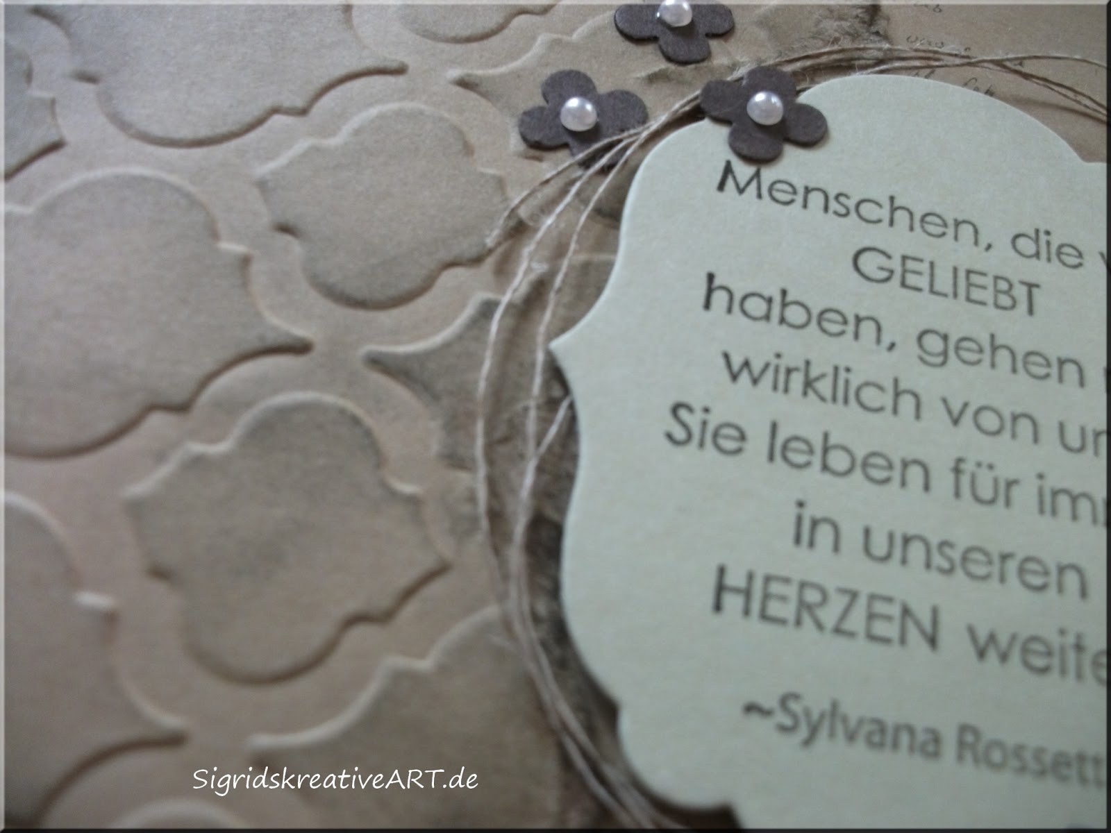 Ein bisschen abgewischt mit Espresso finde ich, dass diese Farbe auch für eine Trauerkarte ausgesprochen passend ist. Den Spruch noch mit ein paar Blümchen und dem Leinenfaden aufgepeppt ist die Karte ganz sicher nicht alltäglich - und das gefällt mir ...