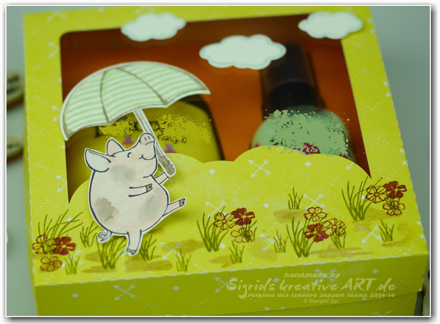 Oh, du hast dem Schweinchen einen Schirm verpaßt. Super Idee. Die Schachtel gefällt mir sehr gut.