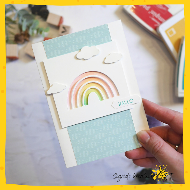 An dieser Karte gefällt mir ganz besonders der 3-D-Effekt des Auflegers und der Wolken. Auch die Pastelltöne des Regenbogens sind wunderschön! Tolles Layout - eine rundherum gelungene Karte!